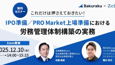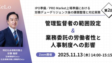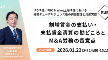 14:00 - 15:15これだけは押さえておきたい!IPO準備/PRO Market上場準備における労務管理体制構築の実務オンライン(Zoom)