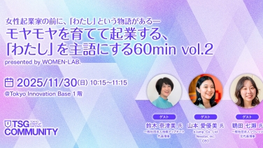 10:15 - 11:15女性起業家の前に、「わたし」という物語がある ― モヤモヤを育てて起業する、「わたし」を主語にする60min vol.2Tokyo Innovation Base 1階