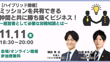 18:30 - 20:00【参加無料】ミッションを共有できる仲間と共に勝ち抜くビジネス! 経営者として必要な労務知識とはNEXs Tokyo 東京都千代田区丸の内3-3-1 新東京ビル4階