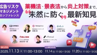 11:00 - 13:00広告リスクマネジメントカンファレンス 薬機法・景表法から炎上対策まで、“未然に防ぐ„最新知見オンライン