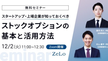 11:00 - 12:30スタートアップ・上場企業が知っておくべきストックオプションの基本と活用方法オンライン(Zoom)