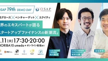 17:30 - 20:00第19期OSAPデモデイ!採択企業ピッチ+セッション "事業グロース × ベンチャーデット × エクイティ 各界のエキスパートが語る「スタートアップファイナンスの新潮流」"NORIBA10