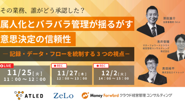 0:00 - 0:002025年11月25日(火) 、11月27日(木)、12月2日(火) その業務、誰がどう承認した? 属人化とバラバラ管理が揺るがす意思決定の信頼性 ― 記録・データ・フローを統制する3つの視点-オンライン(Zoom)
