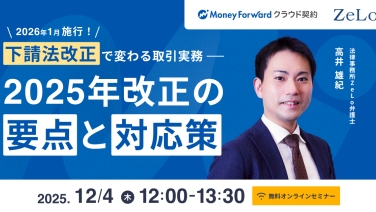 12:00 - 13:302026年1月施行!下請法改正で変わる取引実務―2025年改正の要点と対応策(再放送)オンライン(Event Hub)で開催