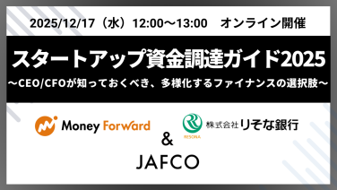 12:00 - 13:00【マネーフォワード & りそな銀行 & JAFCO】スタートアップ資金調達ガイド2025 ~CEO/CFOが知っておくべき、多様化するファイナンスの選択肢~オンライン(EventHub)