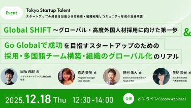 12:15 - 14:00【東京都】【海外展開を目指すスタートアップ必見!】「Global SHIFT~グローバル・高度外国人材採用に向けた第一歩」&「Go Globalで成功を目指すスタートアップのための採用・多国籍チーム構築・組織のグローバル化のリアル」オンライン(ZOOMウェビナー)